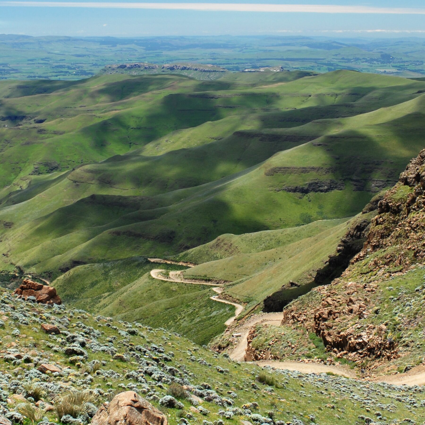 Der Sani Pass ist eine steile Schotterstraße durch die Drakensberge, die KwaZulu-Natal mit dem Königreich Lesotho verbindet. Berühmt für seine Haarnadelkurven, atemberaubenden Ausblicke und das „höchstgelegene Pub Afrikas“, ist die Strecke nur mit einem 4×4-Fahrzeug befahrbar und am besten mit einem erfahrenen Fahrern. Hinter dem Pass erstrecken sich die Hochländer von Lesotho, in denen das Volk der Basotho ein traditionelles Leben in großer Höhe führt.