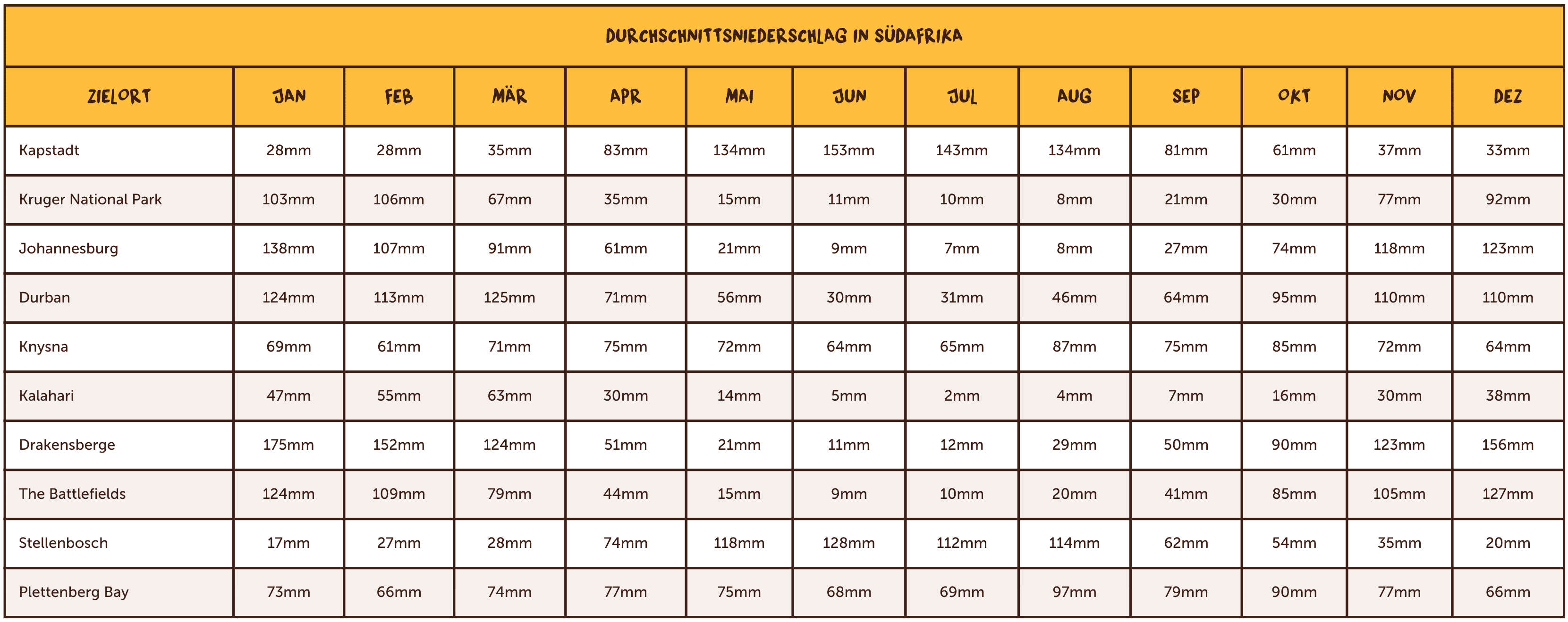 Wenn der Sommer in den Winter übergeht, herrscht in Südafrika ein sehr unterschiedliches Klima. In Regionen wie Kapstadt am Westkap sinken die Durchschnittstemperaturen im Mai auf etwa 20 °C und im Juni und Juli weiter auf durchschnittlich 17 °C. In dieser Zeit fallen in Kapstadt, mit 134 mm im Mai und 153 mm (Höhepunkt der Regenzeit) im Juni, beträchtliche Niederschläge. In Johannesburg liegen die Temperaturen im Mai bei etwa 20 °C und sinken im Juni und Juli auf 17 °C. Die Niederschlagsmenge beträgt im Mai durchschnittlich 21 mm und sinkt im Juni auf nur 9 mm.