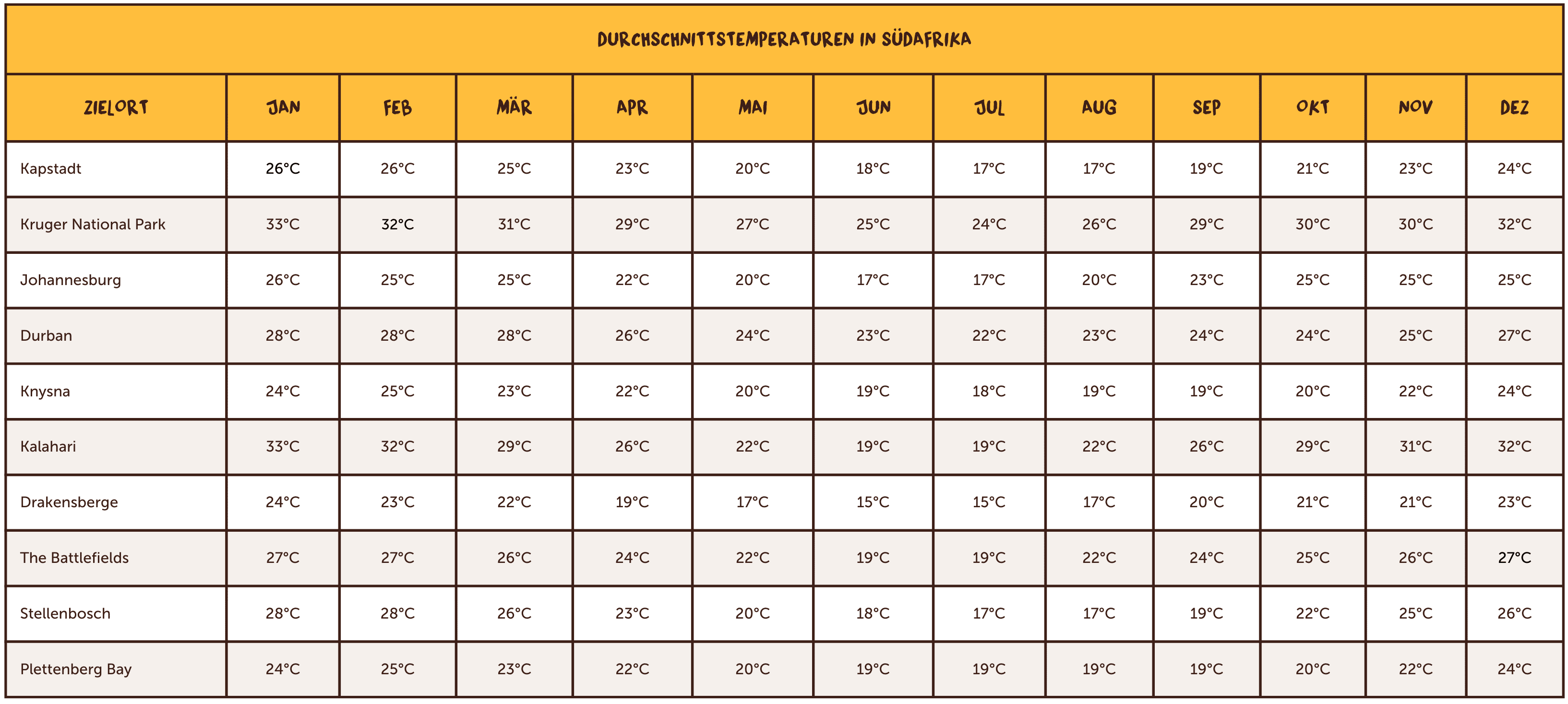 Im Oktober beginnt die heiße Jahreszeit in Südafrika, vor allem in Gebieten wie dem Kgalagadi Transfrontier Park, dem Richtersveld Nationalpark und dem Kruger Nationalpark. Dort kletter das Thermometer am Nachmittag auf bis zu 31 °C. Zwar kann es in dieser Zeit zu Niederschlägen kommen, doch sind diese in der Regel nur von kurzer Dauer und bieten eine willkommene Abkühlung von der Hitze. Weitere sommerliche Reiseziele sind Durban und Pretoria. Hier herrschen ebenfalls sommerliche Temperaturen, oft über 28 °C. Kapstadt ist mit Temperaturen um 26 °C im Dezember und Januar eine sonnige Option. Es ist meistens trocken und luftig, geeignet für Strandtage oder Wanderungen auf den Tafelberg!