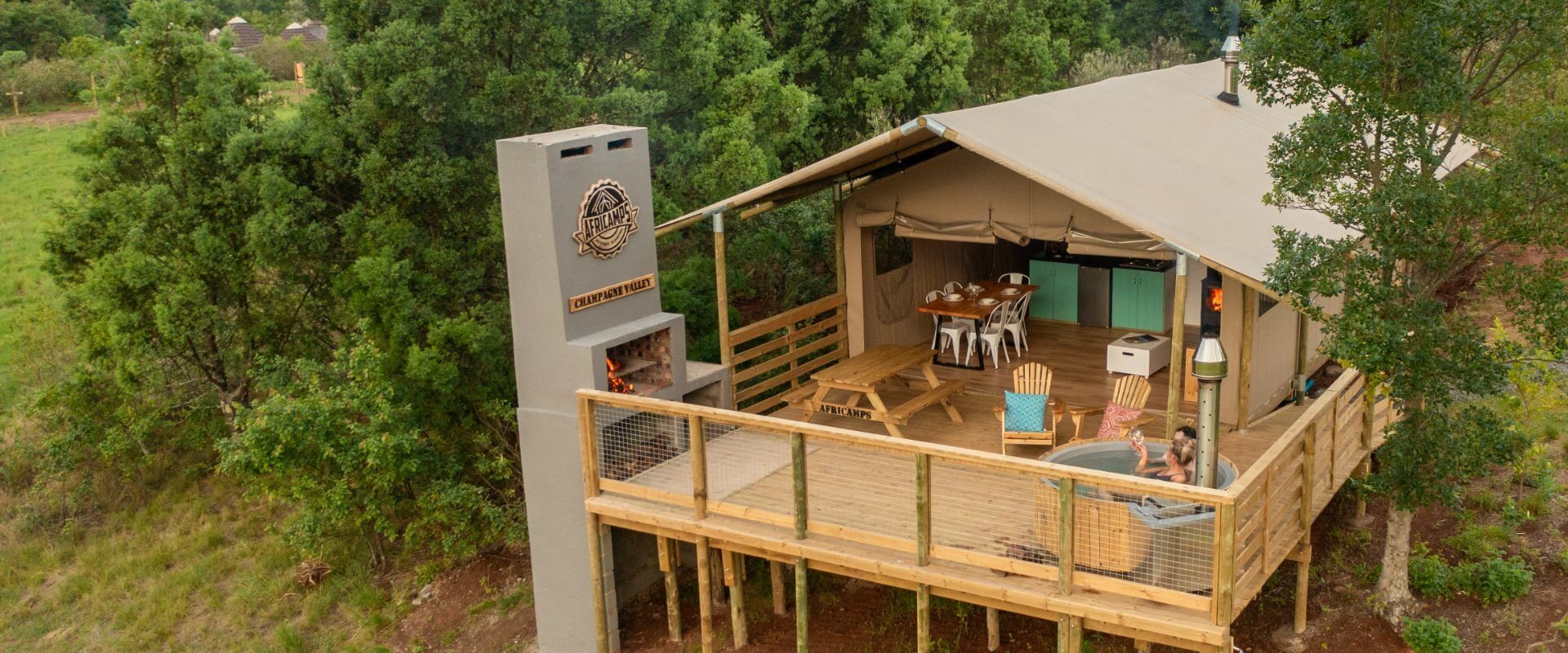 Das AfriCamps Champagne Valley liegt im Herzen des gleichnamigen Valley in den Zentralen Drakensbergen. Es bietet einen atemberaubenden Blick auf die Berge, frische Luft und einen Zeltaufenthalt, der weit mehr als Basic ist. Das Boutique-Glamping-Camp verfügt über mehrere Zelte, die Platz für bis zu fünf Personen bieten und je mit zwei Schlafzimmern, einem Innenkamin, einer Küchenzeile und einem eigenen Bad mit großer Dusche ausgestattet sind. Die 30 Quadratmeter großen Außenterrassen haben viel Platz für einen Tisch, Sonnenliegen, einen Grillbereich und einem holzbeheizten Whirlpool. Und damit Sie von dort aus direkt die rosa gefärbten Sonnenuntergänge auf Social Media teilen können, haben Sie sogar WLAN in Ihrem Zelt. Mit einem Vier-Flammen-Herd, einer Mikrowelle und einem Kühlschrank in Ihrem Cottage ist auch Selbstverpflegung im Urlaub ein Kinderspiel!