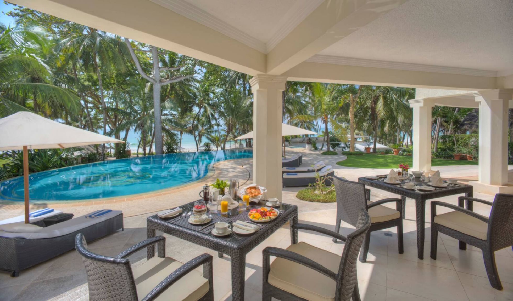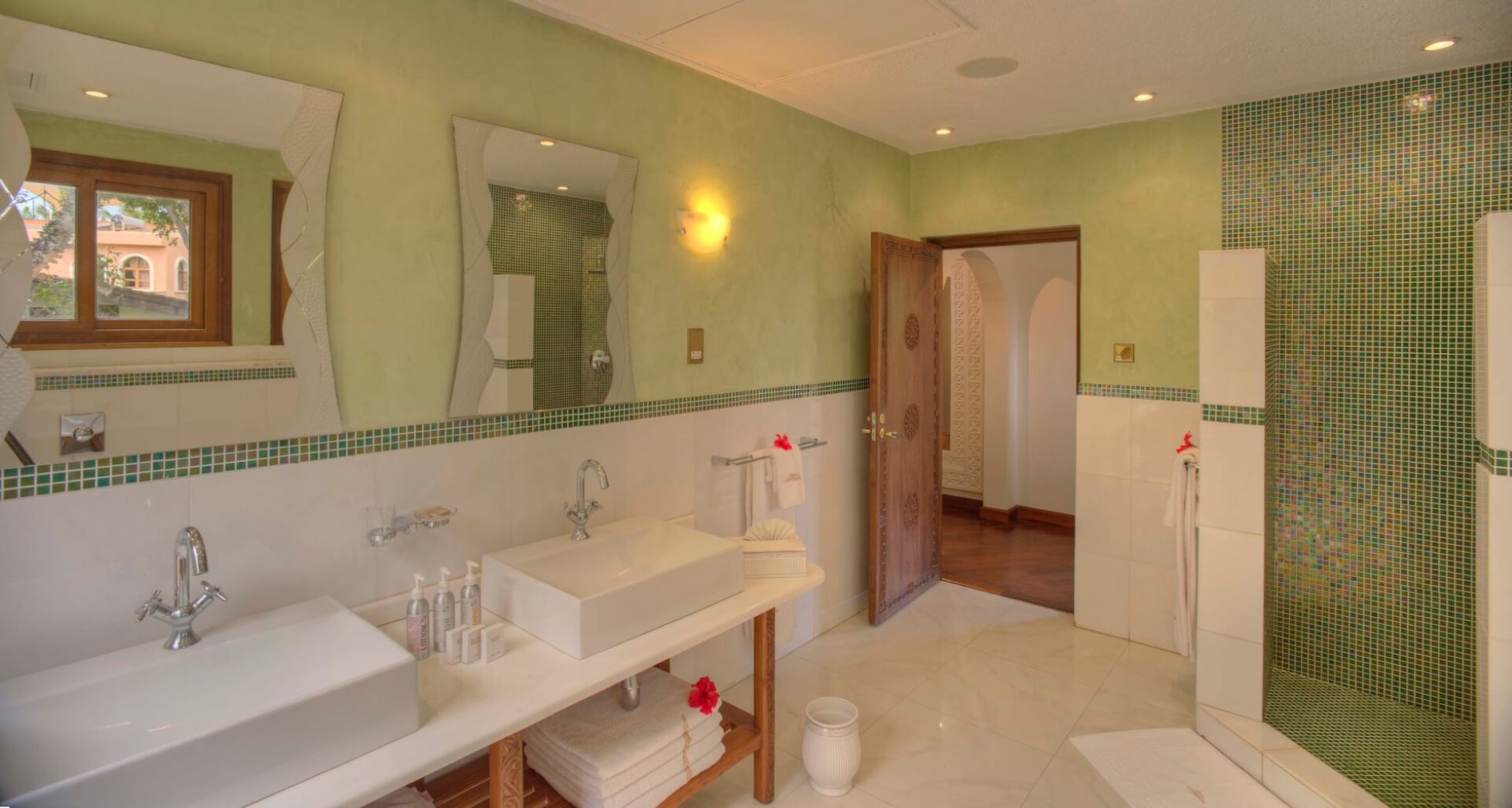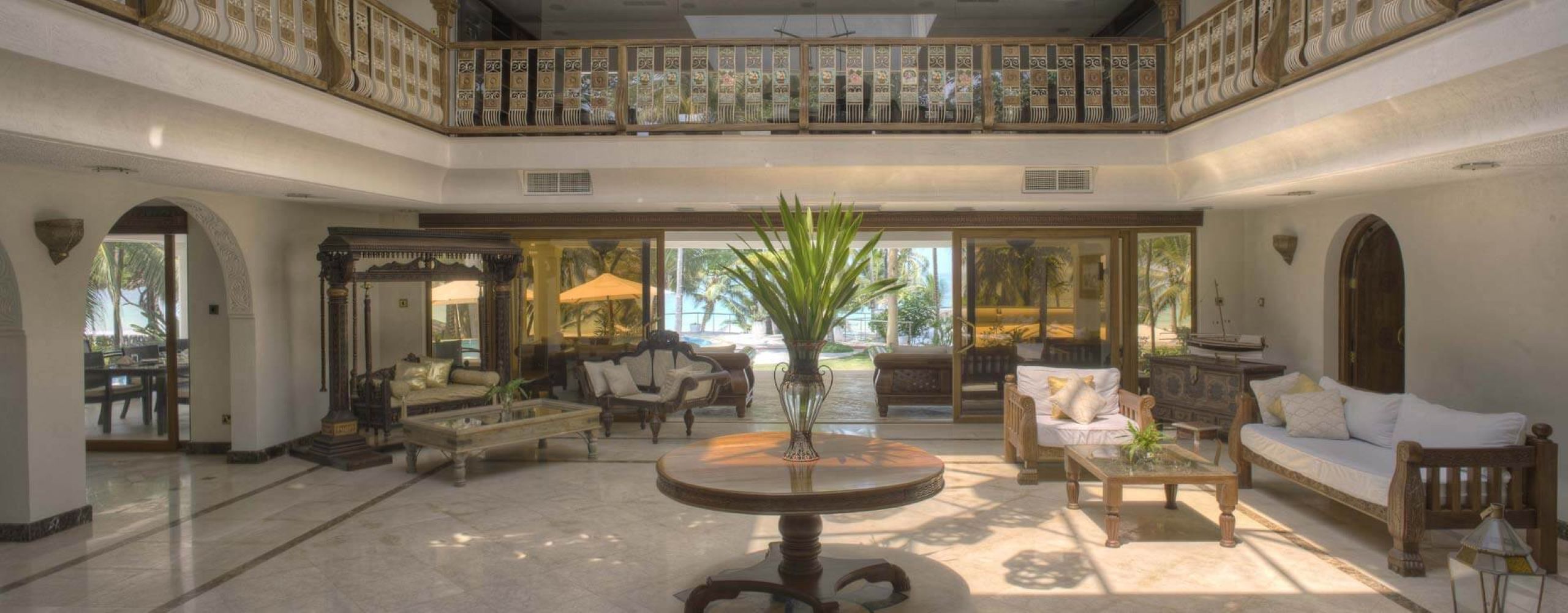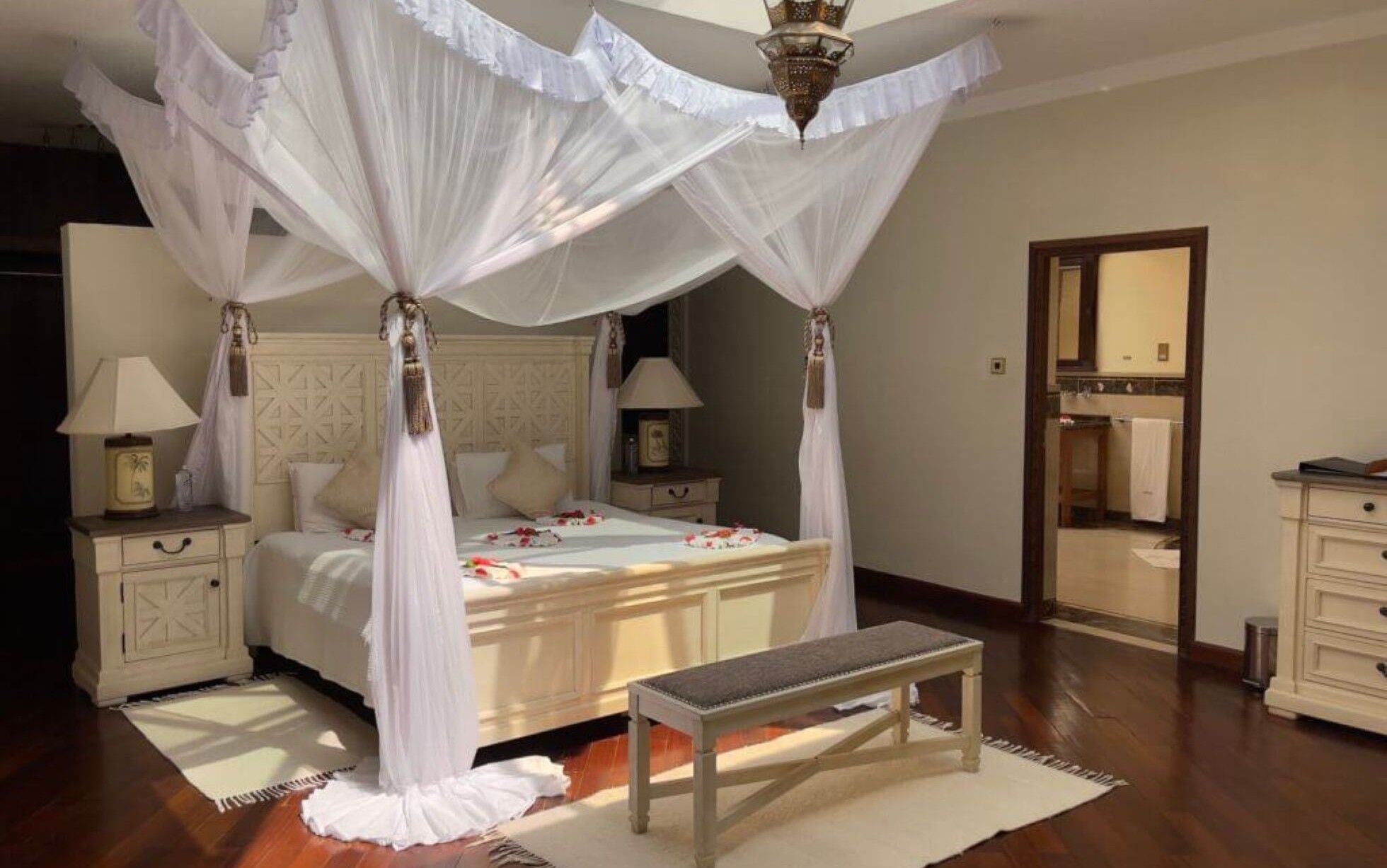 Das Almanara Boutique Hotel ist ein schöner Rückzugsort in Diani Beach mit drei Zimmern und zwei Suiten. Jedes Zimmer ist voll klimatisiert und mit Kingsize-Betten, geräumigen begehbaren Kleiderschränken und Badezimmern mit italienischem Marmor und Mosaik ausgestattet. Die Ozean-Suiten verfügen über Sitzbereiche, Marmorbäder mit Waschtischen für Sie und Ihn und private Balkone mit Blick auf den Swimmingpool und den Indischen Ozean. Die Zimmer sind zwar etwas kleiner als die Suiten, haben aber ebenfalls eine private Veranda und erfreuen sich über eine ordentliche Meeresbrise. Speisen Sie mit Blick auf den Ozean, schauen Sie eine Serie im Fernsehraum oder gehen Sie ins Fitnessstudio. Mit einer maximalen Kapazität von 10 Gästen bietet das Almanara genügend Platz für einen entspannten Aufenthalt!