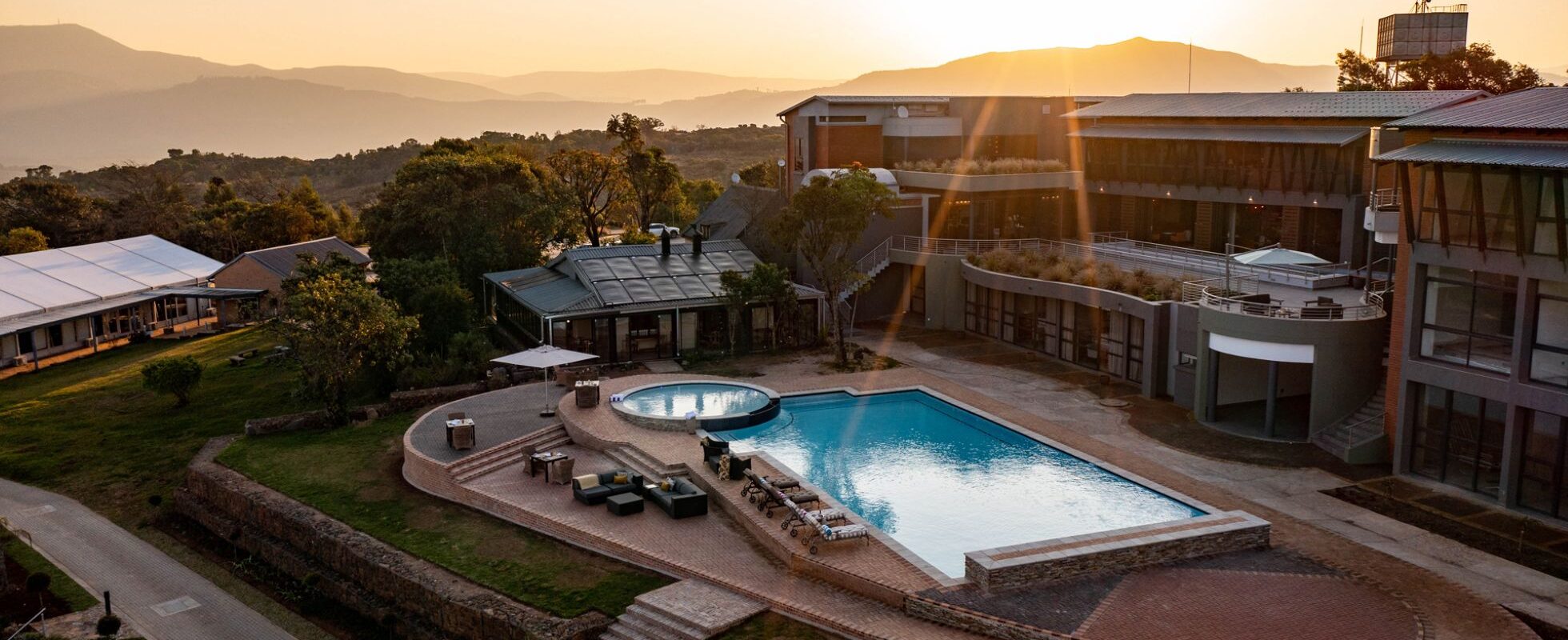 Das Hoyohoyo Angels View Graskop ist ein elegantes Design-Hotel am Rande der Drakensberge in der Nähe der Panorama-Route „God’s Window“ in Graskop, Mpumalanga. Das hundert Hektar große Anwesen verfügt über spektakuläre Landschaftsgärten und bietet luxuriöse Unterkünfte in verschiedenen Formen und Größen (von 2 bis 8 Personen), die alle mit geräumigen Lounges und privaten Terrassen mit atemberaubender Aussicht ausgestattet sind. Die Badezimmer verfügen über frei stehende Badewannen und offene Regenduschen. Zu den weiteren Annehmlichkeiten gehören Klimaanlage, Miniküche, Satellitenfernsehen und WLAN. Es gibt einen Swimmingpool, eine Poolbar und eine Bibliothekslounge, und auch das Hotelrestaurant (mit privatem Speisesaal für bis zu 12 Gäste) lässt keine Wünsche offen. Ach ja, für den Fall, dass – Sie mit dem Flugzeug anreisen, es gibt sogar eine private Landebahn (Graskop Airfield)!