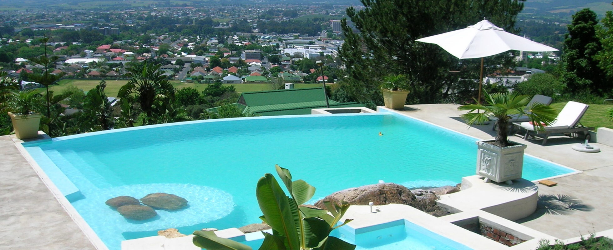 Das Perle-du-Cap befindet sich in Paarl (oder besser gesagt „Der Perle der Kap-Weinregion“, wie die Einheimischen Paarl gerne nennen) auf einem Hügel, umgeben von üppigem Grün und Wasserfällen. Obwohl das stilvolle Bed&Breakfast nur wenige Minuten vom historischen Stadtzentrum entfernt ist, garantiert die höhere Lage einen schönen Rückzugsort, sowie spektakuläre Ausblicke über das Tal und den Paarl-Berg. Das Perle-du-Cap bietet 5 gemütliche und elegante Doppelzimmer, alle mit eigenem Bad und modernen Annehmlichkeiten wie Klimaanlage, einer voll ausgestatteten Minibar, Kaffee- und Teestation, einem Bar-Kühlschrank, TV und WLAN. Beginnen Sie Ihren Tag mit einem Gourmetfrühstück, tauchen Sie in den kristallklaren Infinity-Pool ein (dieser wird mit reinem Quellwasser gespeist, das vom Paarl-Berg herabfließt) oder genießen Sie die Sonne auf der Terrasse.