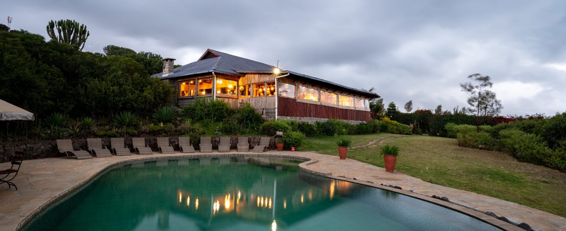Die Rhino Watch Safari Lodge liegt im zentralen kenianischen Hochland und bietet einen wunderschönen Blick auf den Mount Kenia. Sie ist eine Oase der Ruhe inmitten der weiten Natur des umliegenden Hochlandes. Umgeben von drei Wildreservaten voller Nashörner, eignet sich die Lodge ideal als Ausgangspunkt für Pirschfahrten. Mit 9 Doppelchalets, 2 Familienchalets und 9 exklusiven Safarizelten bietet diese Lodge Wohlfühlunterkünfte für jedermann. In der Mitte der Lodge befindet sich ein Teich, an dem Webervögel gerne nisten. Direkt daneben ist eine Bibliothek mit einer kleinen Sunset-Bar. Der Spa-Bereich mit Sauna, entspannendem Jacuzzi und Massageraum lädt nach einem anstrengenden Safari-Tag zum Entspannen ein, bevor Sie sich im Restaurant bei einem Sundowner an der Buschbar mit Köstlichkeiten aus der Buschküche verwöhnen lassen können.