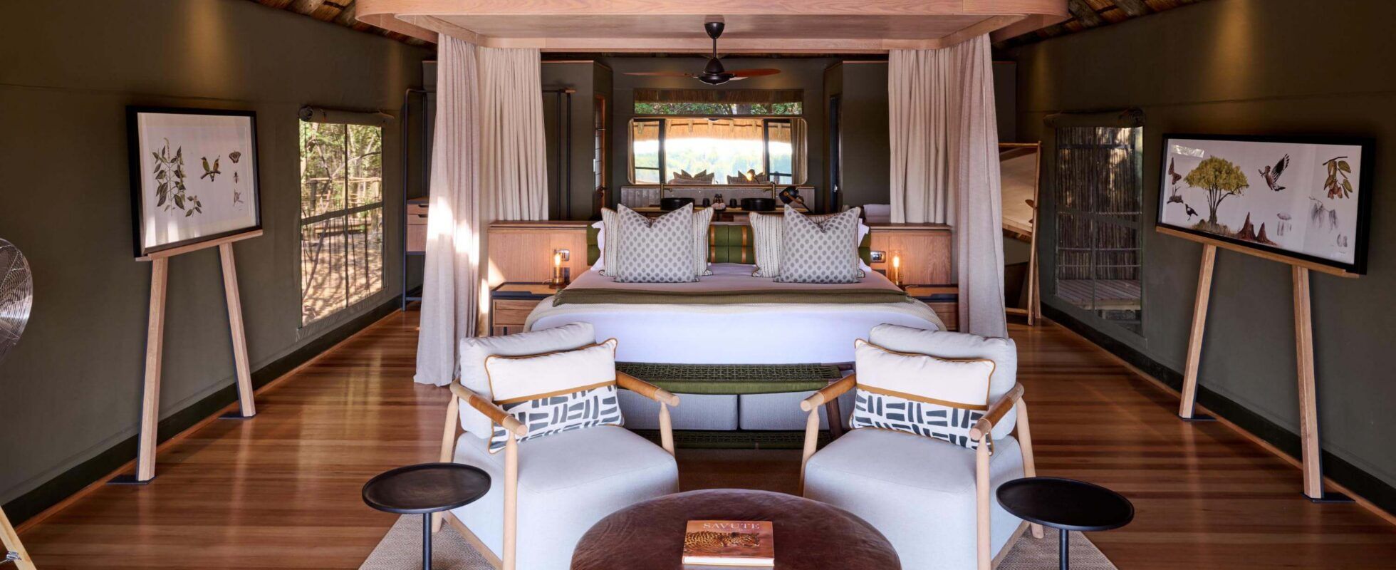 Entlang des dynamischen Savute-Kanals im Chobe-Nationalpark bietet die Savute Safari Lodge Platz für bis zu 24 Gäste in 12 Chalets aus Holz und Stroh, darunter eine Familieneinheit mit miteinander verbundenen Zimmern. Jedes Chalet verfügt über eine private Terrasse, ein eigenes Bad und einen kombinierten Wohn- und Schlafbereich. Die Hauptlodge beherbergt eine Lounge, eine Bar, einen Essbereich und eine Aussichtsplattform, während der Swimmingpool und die Feuerstelle im Freien einen Blick auf ein Wasserloch bieten, das oft von Elefanten besucht wird. Mit eleganten Gemeinschaftsräumen und gemütlichen Chalets mit Blick auf den Fluss bietet die Lodge Komfort gepaart mit Wildtierbegegnungen aus nächster Nähe.
