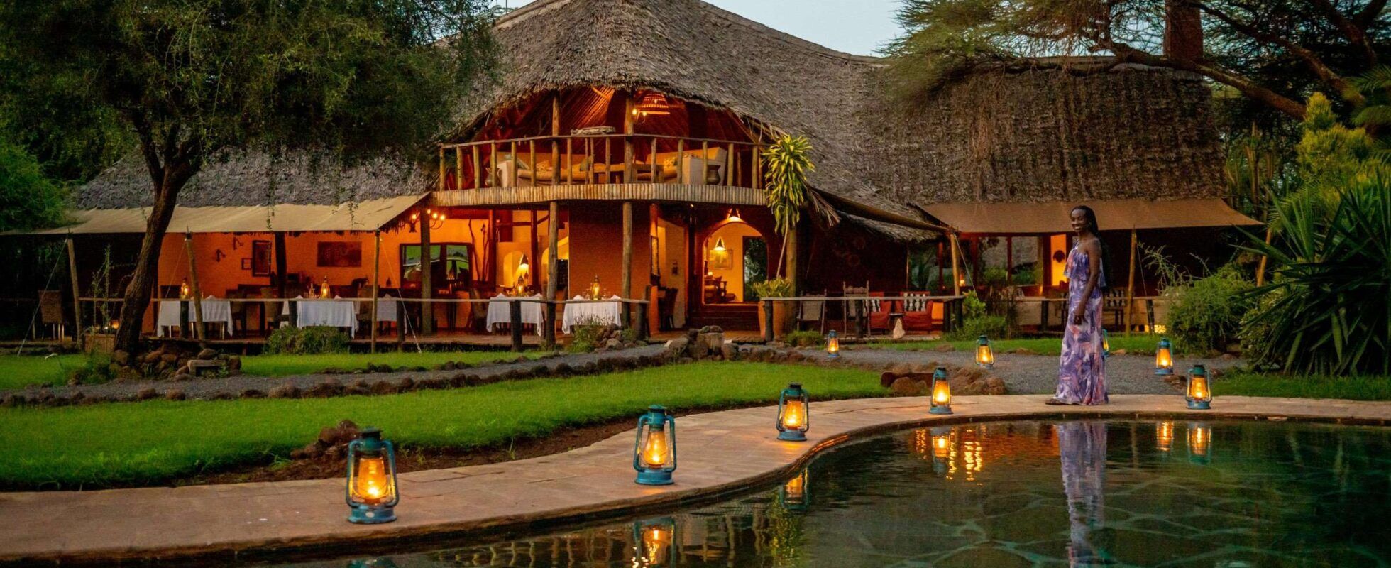 Die Tawi Lodge liegt auf einem Privatgrundstück in der Nähe des Kimana-Tors im Osten des Amboseli Nationalparks. Sie bietet einen schönen Blick auf den Kilimandscharo in der Ferne und ein nahe gelegenes Wasserloch, an dem Elefanten, Zebras, Impalas, Kudus und Gerenuks täglich zum Trinken kommen. Die Lodge ist in einem modernen, komfortablen Stil eingerichtet und von schön gepflegten Rasenflächen und einem üppigen Garten umgeben. Gleich dahinter beginnt schon die Savanne, in der Elefanten vorbeiziehen. Die Zimmer sind in dunklem Holz gehalten, mit weiß getünchten Wänden unter einem Strohdach. Die schweren Möbel sind bequem und die Aussicht von den Terrassen der Cottages ist einfach fantastisch. Im geräumigen Hauptbereich der Lodge finden Sie ein Restaurant, eine Bar, eine Lounge und einen Kamin, sowie im Freien einen Swimmingpool, eine Terrasse und eine Feuerstelle. Die Küche ist experimentierfreudig und verwendet nur frische Zutaten, die zu schmackhaften Gerichten verarbeitet werden, die sowohl europäisch als auch Swahili inspiriert sind. Ein schöner Ort zum Verweilen!