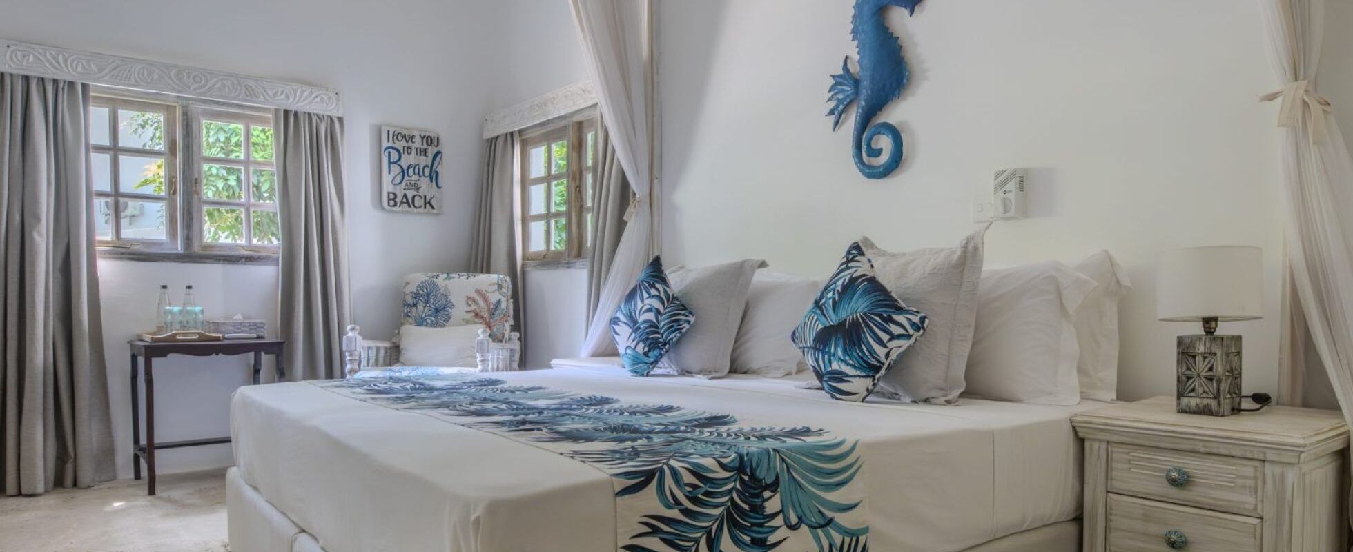 Das Resort, am berühmten Diani Beach in der Nähe von Mombasa, verfügt über neun verschiedene Zimmer, die gut ausgestattet sind und teilweise sogar über einen privaten Whirlpool, Terrassen mit Panoramablick und nicht nur ein Schlafzimmer, sondern auch ein geräumiges Wohnzimmer verfügen. Familien haben in den Zimmern im Erdgeschoss des im Hacienda-Stil errichteten Hotelgebäudes ausreichend Platz, während Paare ihre Privatsphäre in den schönen Strandhäuschen finden können. Diese liegen nur fünfzehn Schritte vom Indischen Ozean entfernt und verfügen über einen kleinen Garten mit Sonnenliegen, auf denen Sie sich nach dem Schwimmen entspannen können.