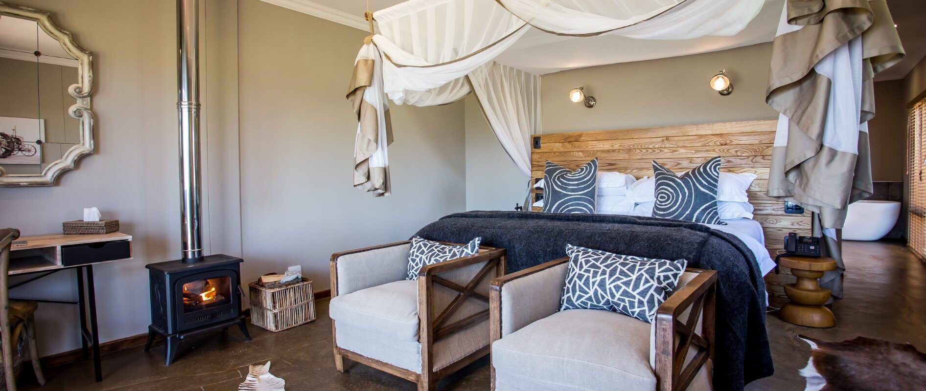 Das Botlierskop Private Game Reserve & Villas liegt in einem 4.500 Hektar großen Wildreservat zwischen Mossel Bay und George und garantiert ein exklusives südafrikanisches Safarierlebnis. Jede der luxuriösen Zeltsuiten ist elegant im romantischen Kolonialstil eingerichtet und verfügt über Himmelbetten mit Moskitonetzen sowie ein eigenes Bad mit Doppelwaschbecken, frei stehender Badewanne und Außendusche. Großzügige Holzdecks garantieren einen atemberaubenden Blick auf das Reservat mit vielen frei lebenden Wildtieren und die majestätischen Berge. Es gibt ein hervorragendes Restaurant (mit Innen- und Außenbereich), ein Spa, einen Fitnessraum und zwei Pools. Kinder ab 6 Jahren sind im Junior Ranger Programm und im Kids Club willkommen.