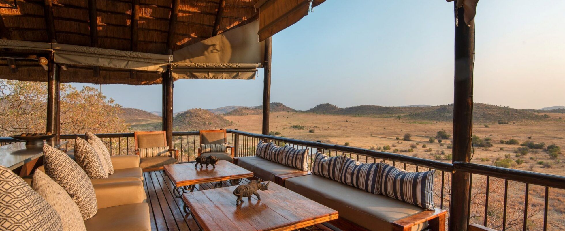 Die Tshukudu Bush Lodge liegt im Pilanesberg Nationalpark – der bekannt für die Big Five und eine Vielzahl anderer Wildtiere ist. Sie verfügt über zehn luxuriöse Chalets und Suiten, die in einen felsigen Hang eingebettet sind. Jedes Chalet ist mit einem Queen- oder Kingsize-Bett und einer privaten Terrasse ausgestattet und bietet einen spektakulären Blick auf das Wasserloch darunter. Die Badezimmer verfügen über eingelassene Badewannen (der Blick in den Busch ist fantastisch!) und große Duschen. Zu den weiteren Annehmlichkeiten gehören ein Day Bed, ein offener Aufenthaltsraum mit Kamin und ein kleiner Pool mit Sonnenliegen, der der Privatsphäre wegen von Schilfwänden umgeben ist. Freuen Sie sich auf kulinarische Köstlichkeiten im The Dining Room, wo Frühstück, High Tea und Fünf-Gänge-Dinner serviert werden – drinnen, auf der Terrasse oder im Freien unter dem Sternenhimmel! Kinder ab 12 Jahren sind in der Lodge herzlich willkommen.